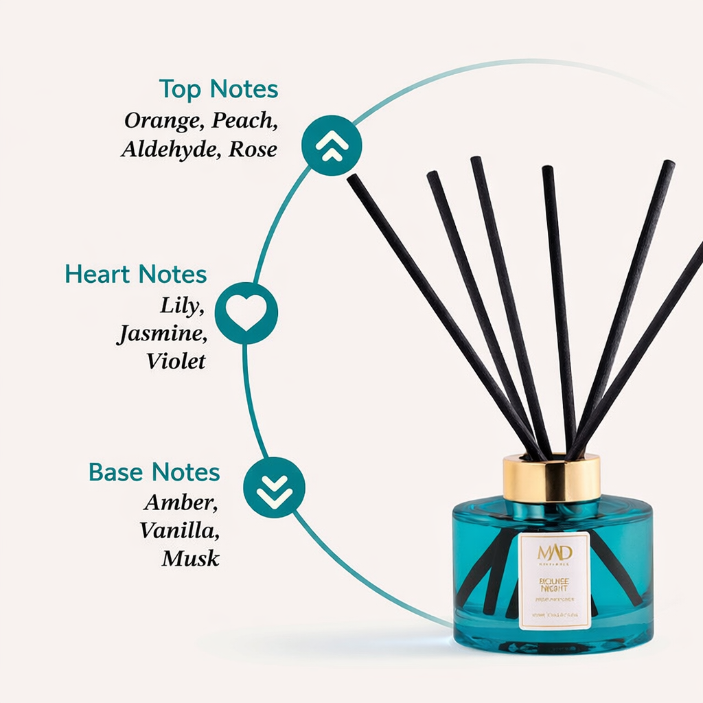 Infuses your space with deep floral notes and soft warmth, enhancing the nighttime ambiance with elegance and romance.