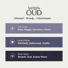 A fragrance that begins with a delicate yet vibrant interplay of rose, spicy pepper, and the refreshing clarity of geranium, softened by the powdery lightness of violet. As it unfolds, the heart reveals a deeper story—earthy patchouli and textured cedarwood enriched by the smooth sweetness of vanilla. Finally, the base grounds the scent in mystery: the smoky elegance of oud, the resinous warmth of benzoin, and the creamy depth of guaiac wood.